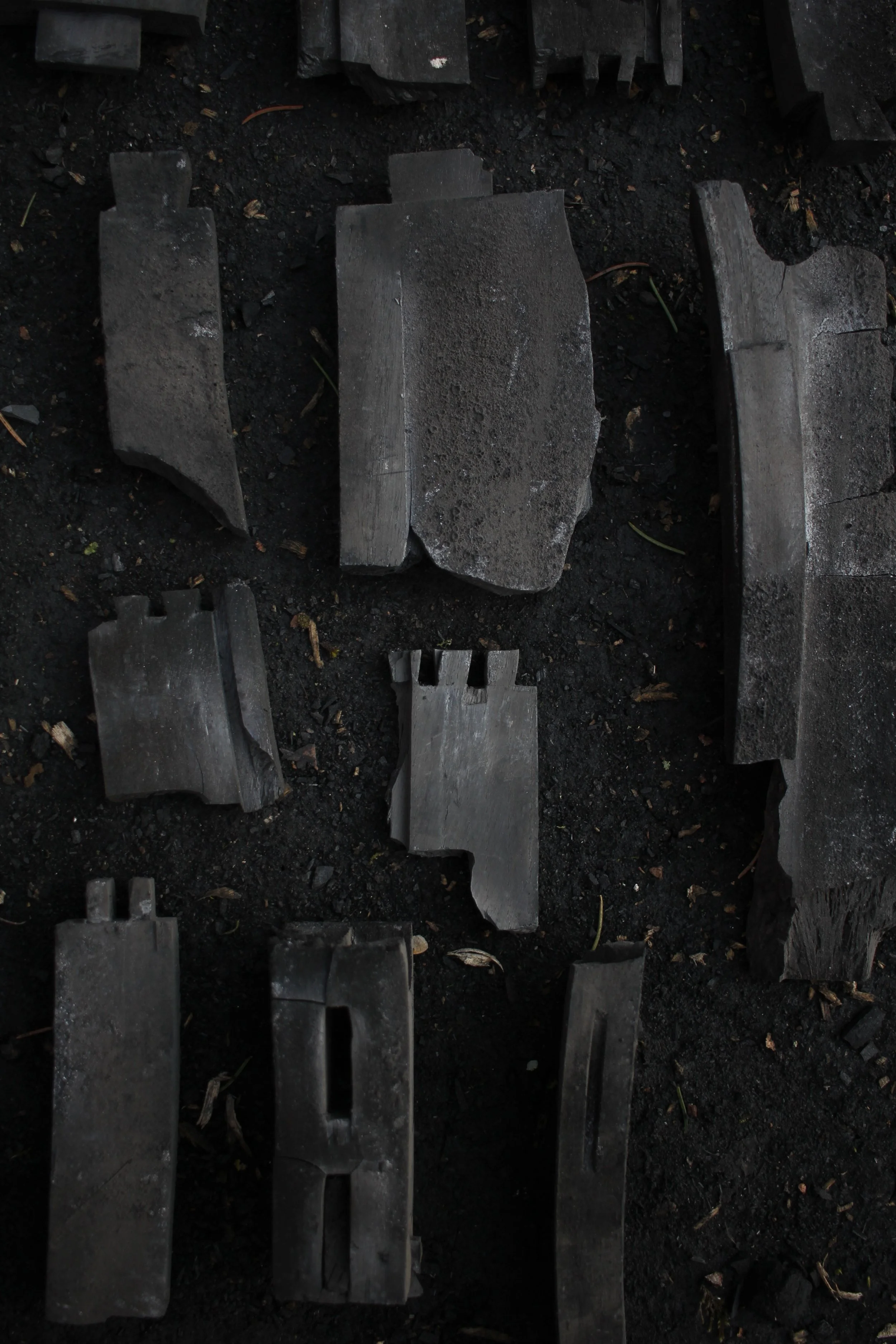 Au milieu de ça, du charbon traîne sur des étagères. Comme figés par le feu, ces morceaux de bois brûlés ont conservé leur aspect d’origine. L’écorce, l’aubier, la mousse fine et délicate s’est transformée en une dentelle carbonisée. Les galeries encore intactes des insectes xylophages laissent trace d’un passage. Les reflets argents et bleus jouent avec la lumière et rappellent la technique japonaise du Yakisugi. Lorsqu’il est manipulé, le charbon dense et cassant, sonne comme du verre au touché et cliquette comme de la céramique en sortie de four.